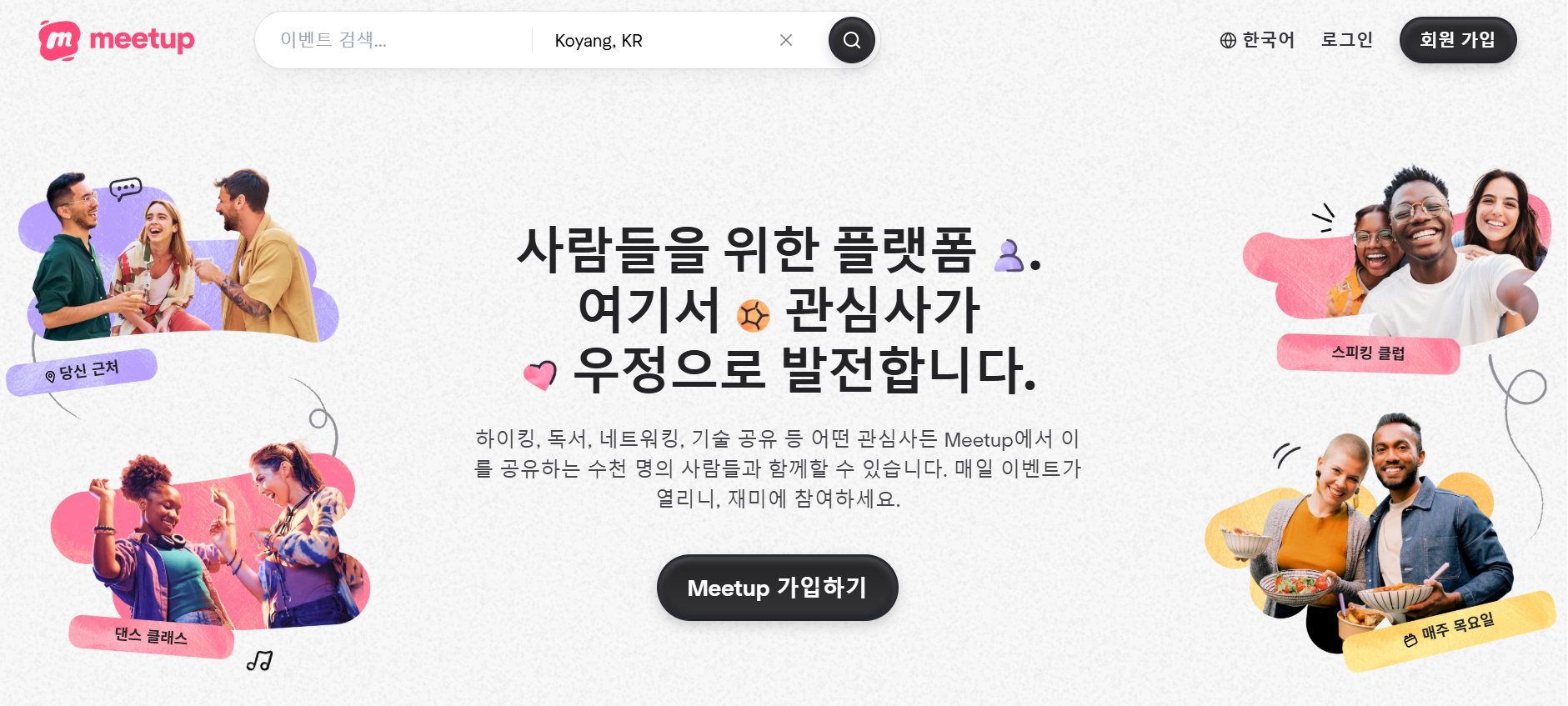 ๋ํ์ ์ธ ๋ชจ์ ์ฑ ‘Meetup’์ ํํ์ด์ง โMeetup