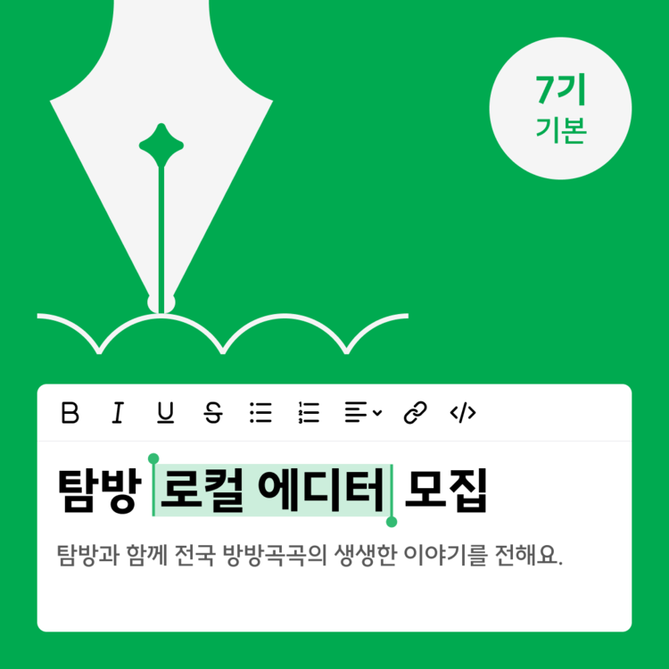 탐방과 함께 전국 방방곡곡의 생생한 이야기를 전할 <로컬 에디터 7기 : 기본과정>을 모집해요. 기본과정은, 에디터로서의 기본기를 탄탄하게 만들고 전국의 다양한 로컬 친구를 사귈 수 있을 거예요.